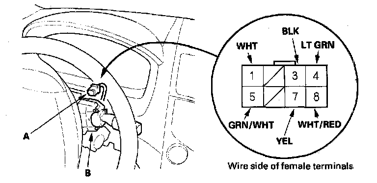 4. Disconnect the 8P connector (A) from the wiper/washer switch (B).