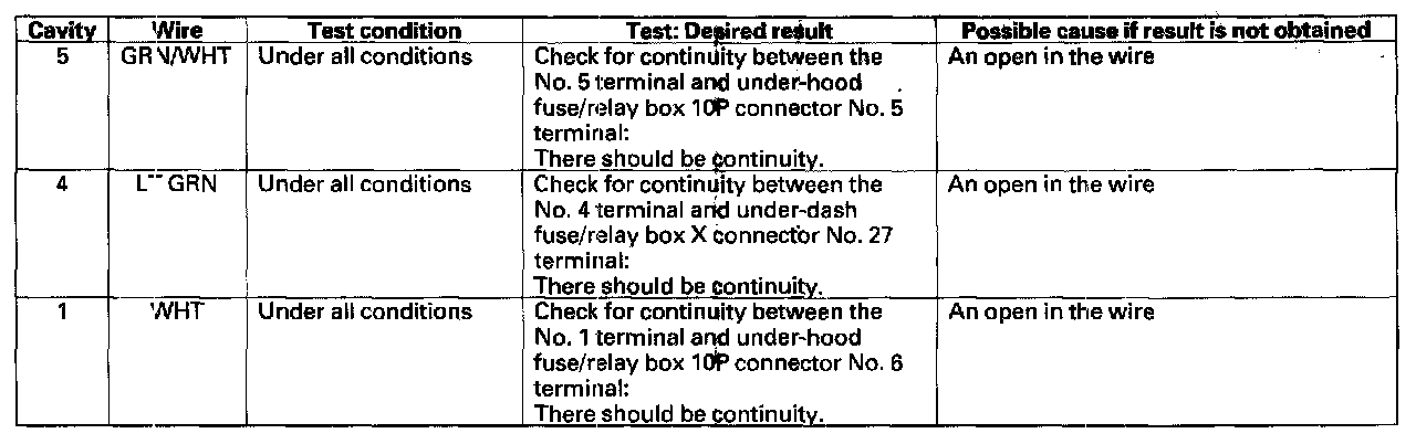 7. Disconnect the connector from the wiper/washer switch, and make these input tests at the connector.
