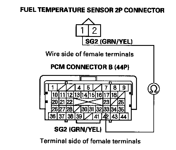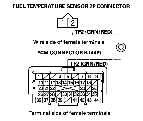 15. Check for continuity between fuel temperature sensor 2P connector terminal No. 1 and PCM connector terminal B33.