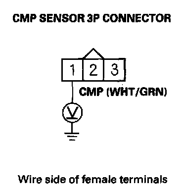 9. Measure voltage between CMP sensor 3P connector terminal No. 1 and body ground.
