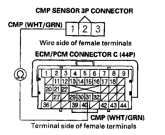 15. Check for continuity between CMP sensor 3P connector terminal No. 1 and ECM/PCM connector terminal C31.