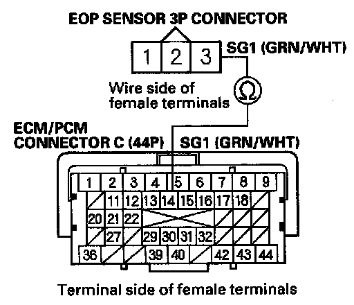 13. Check for continuity between ECM/PCM connector terminal C14and EOP sensor 3P connector terminal No. 3.