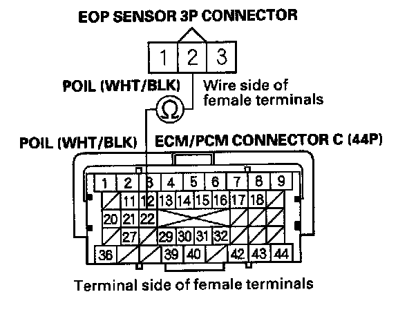 17. Check for continuity between ECM/PCM connector terminal C22 and EOP sensor 3P connector terminal No. 2.
