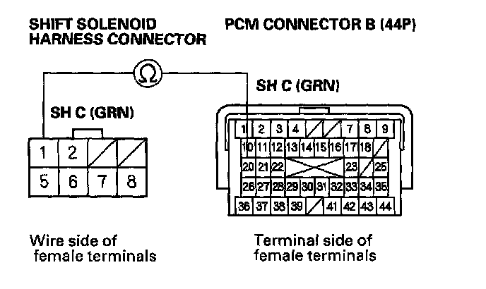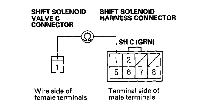 14. Check for continuity between shift solenoid harness connector terminal No. 1 and shift solenoid valve C connector terminal.