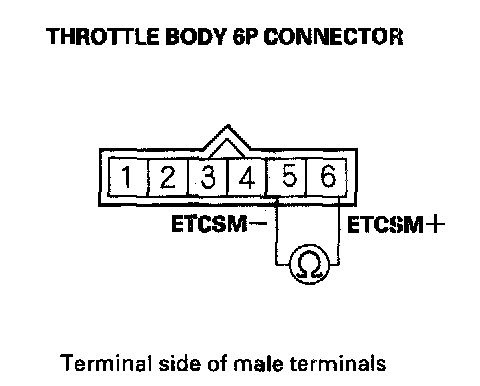 5. At the throttle body side, measure resistance between throttle body 6P connector terminals No. 5 and No. 6 with the throttle fully closed.