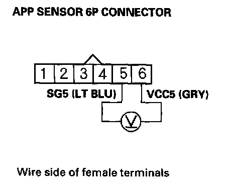 6. Measure voltage between APP sensor 6P connector terminals No. 5 and No. 6.
