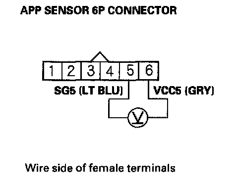 6. Measure voltage between APP sensor 6P connector terminals No. 5 and No. 6.