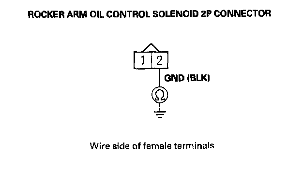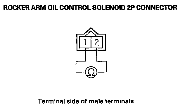 7. Measure resistance between rocker arm oil control solenoid 2P connector terminals No. 1 and No. 2.