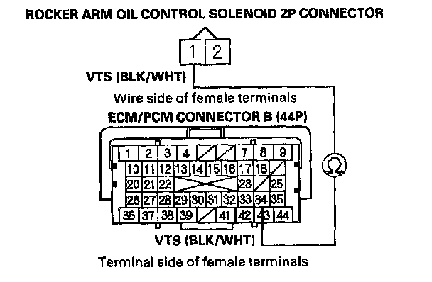 11. Check for continuity between ECM/PCM connector terminal B34 and rocker arm oil control solenoid 2P