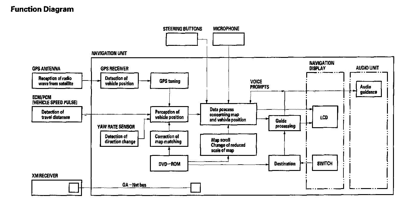 The navigation system is composed of the navigation unit, the ECM/PCM (vehicle speed signal), the GPS antenna, microphone, voice control switch, XM receiver, and the climate control unit. These units communicate with each other on the GA-Net bus.