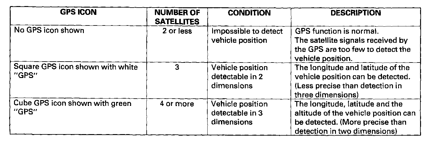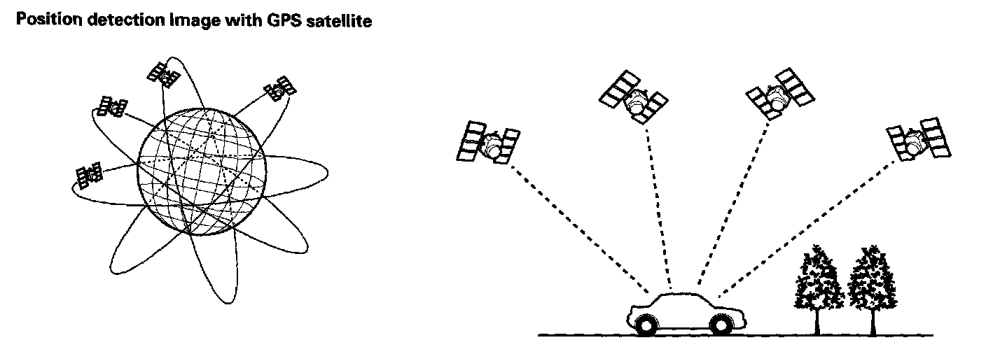 The global positioning system (GPS) enables the navigation system to determine the current position of the vehicle by using the signals transmitted from the satellites in orbit around the earth. The satellites transmit the satellite identification signal, orbit information, transmission time signal, and other information. When the GPS receiver receives a signal from three or more satellites simultaneously, it calculates the current position of the vehicle based on the distance to each satellite and the satellite's positions in its respective orbit.