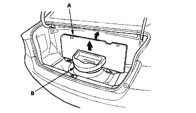 1. Pull the trunk floor (A) up, then remove the trunk tool box (B).