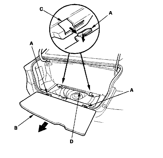 2. While pushing both hooks (A) down with your hands, pull the trunk floor (B) back to release these hooks from the holes (C) in the trunk front trim panel (D), then remove the trunk floor.