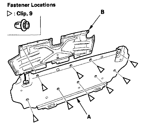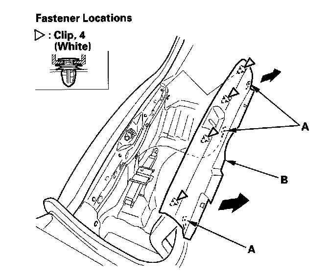 7. If necessary, remove the clips, then separate the trunk front trim panel (A) and trunk partition (B).