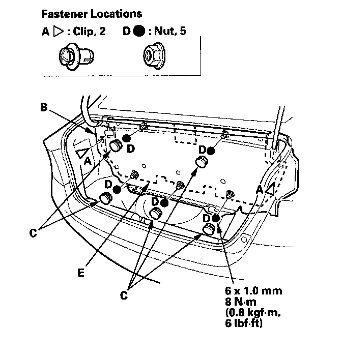 5. Remove the clips (A) securing the trunk front trim panel (B), and using a trim tool, remove the caps (C), and remove the nuts (D) securing the trunk partition (E).
