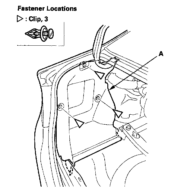 8. Remove the clips, then remove the trunk side trim panel (A).