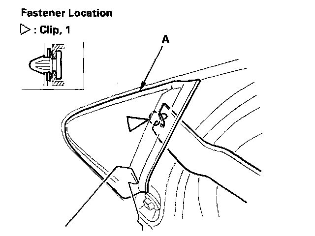 3. Pull the A-pillar corner trim (A) back by hand to detach remaining lower clips, then remove the trim.