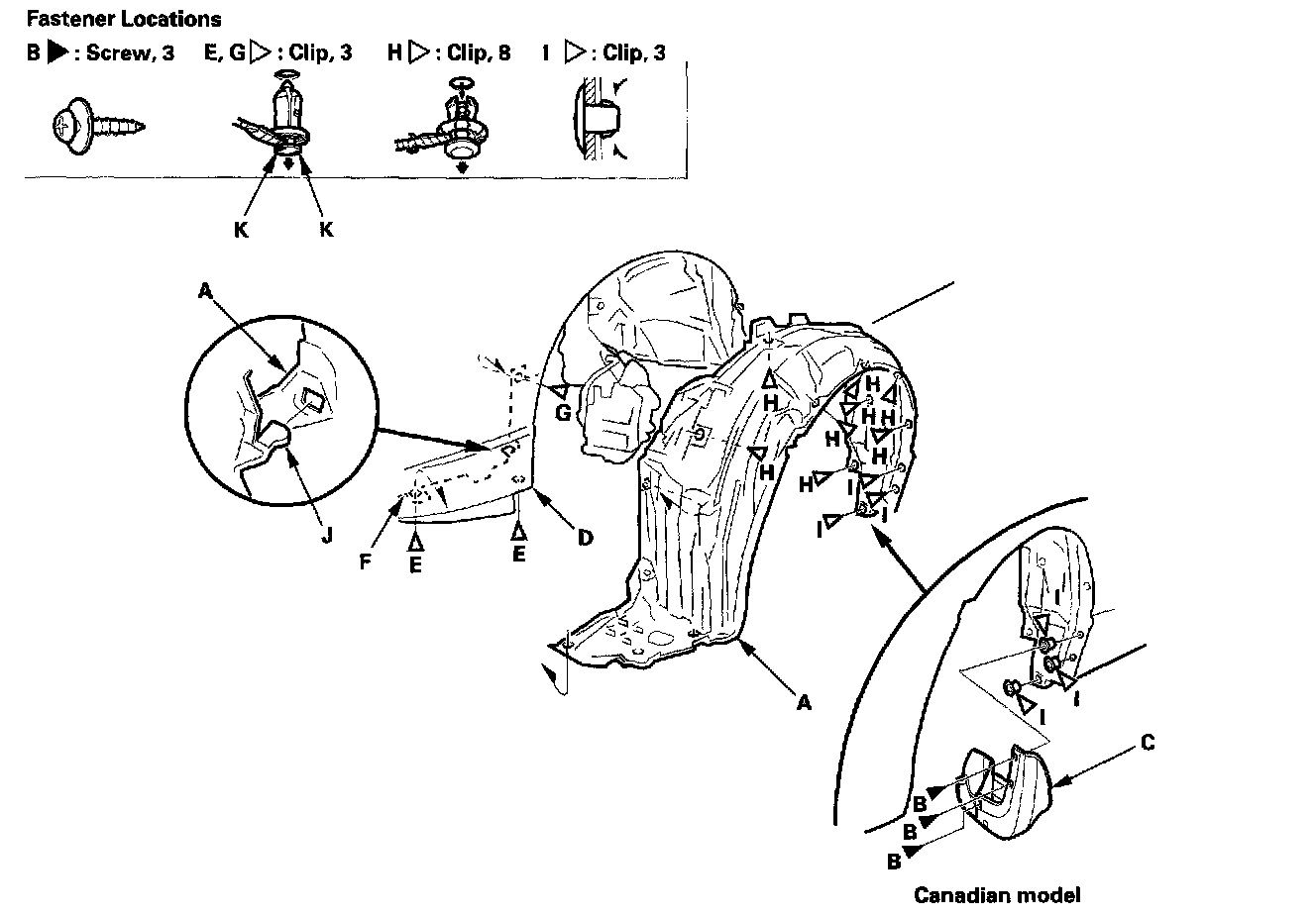 3. From the wheel arch, remove the clips (I, J, K) securing the front inner fender (and splash shield) to the body.