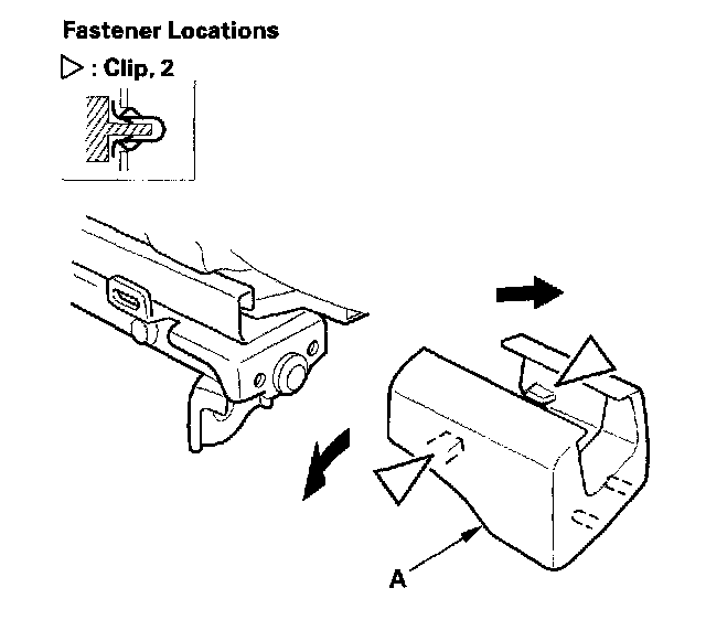 2. Slide the front seat frame rearward fully, detach the clips, then remove the front rail covers (A) from the front of both seat tracks.