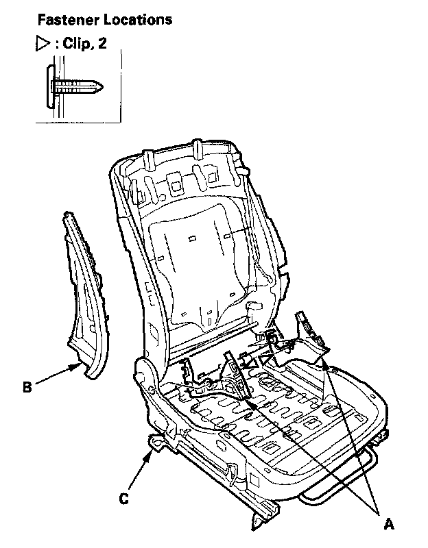 3. Remove the clip, then remove the recline inner covers (A) from the seat frame (B), with side airbag remove the module holder (C).