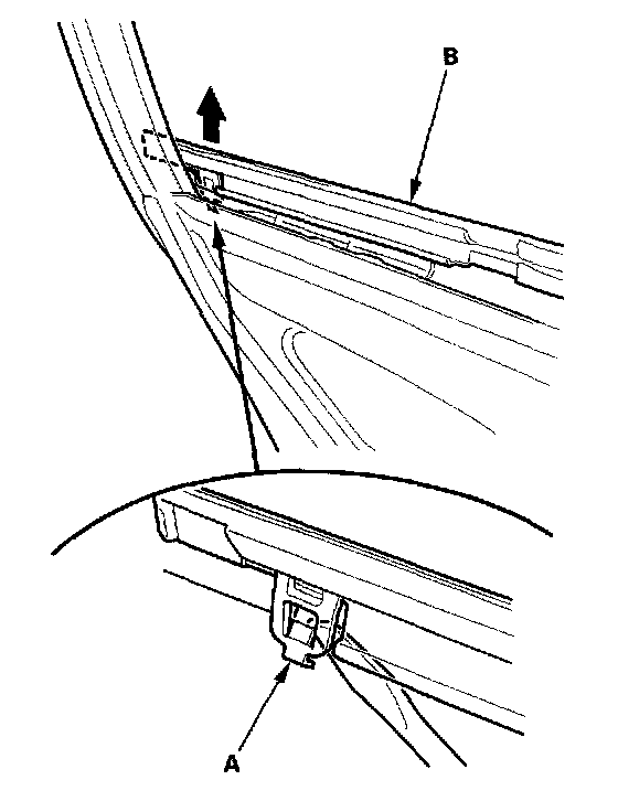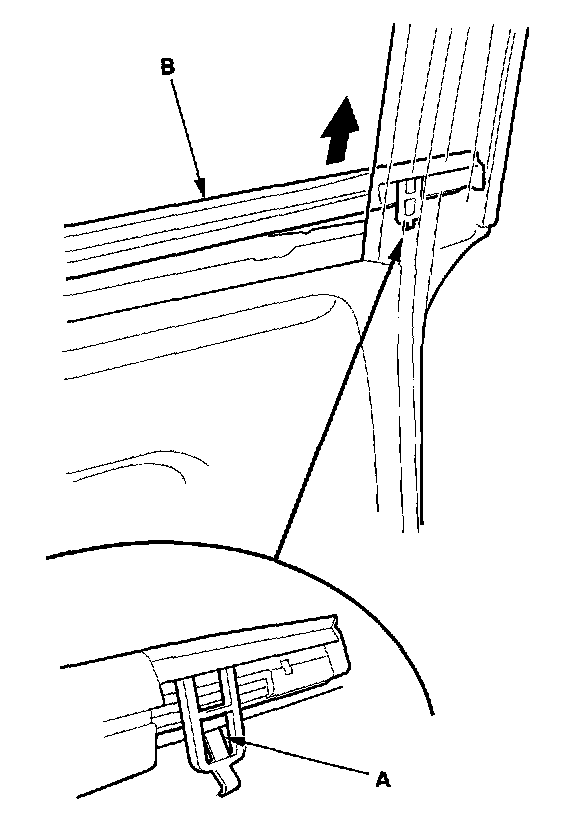 2. Release the front hook (A) from inside of the door, then pull up the front portion of the rear door glass outer weatherstrip (B).