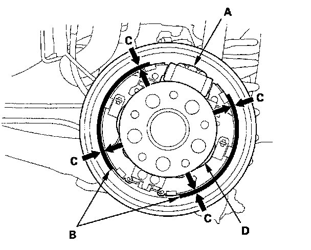 6. Measure the brake lining thickness (C). Measurement does not include brake shoe thickness.