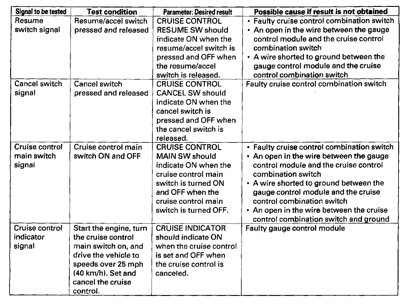 NOTE: Intermittent failures are often caused by loose circuit connections. While monitoring cruise control inputs, flex their circuits, and note if any of the test results change.