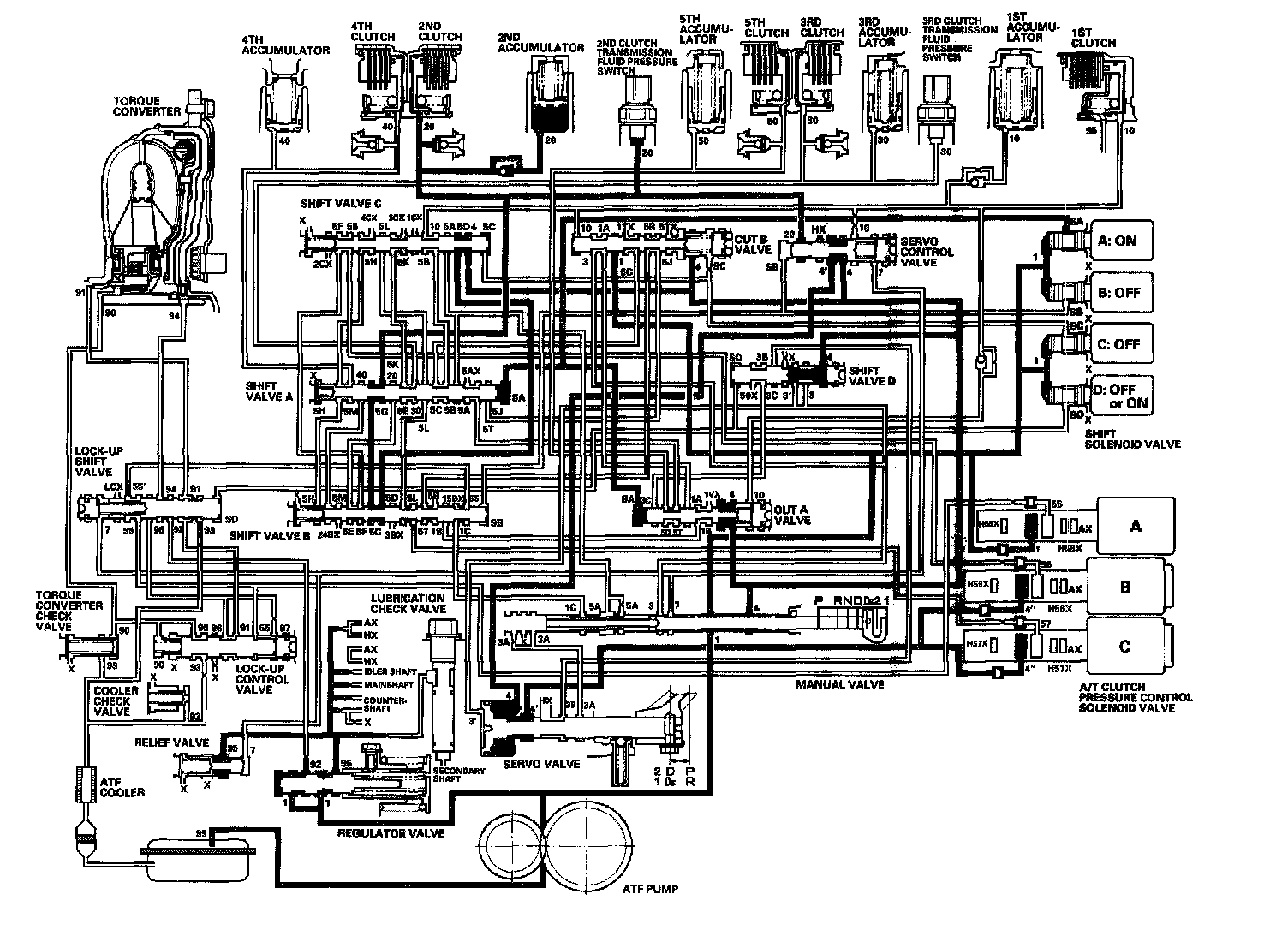 As the engine turns, the ATF pump starts to operate. Automatic transmission fluid (ATF) is drawn through the ATF strainer (filter) and discharged into the hydraulic circuit. Then, ATF flowing from the ATF pump becomes line pressure that is regulated by the regulator valve. Torque converter pressure from the regulator valve enters the torque converter through the lock-up shift valve, and it is discharged from the torque converter. The torque converter check valve prevents torque converter pressure from rising. The PCM controls the shift solenoid valves ON and OFF. The shift solenoid valve blocks line pressure from the ATF pump via the manual valve when the shift solenoid valve is OFF. When the shift solenoid valve is turned ON by the PCM, line pressure changes to shift solenoid valve pressure at the shift solenoid valve, then the shift solenoid valve pressure flows to the shift valve. Applying shift solenoid pressure to the shift valve moves the position of the shift valve, and switches the port of the hydraulic circuit. The PCM also controls A/T clutch pressure control solenoid valves A, B, and C. The A/T clutch pressure control solenoid valves regulate hydraulic pressure, and apply the pressure to the clutches to engage smoothly. The clutches receive optimum clutch pressure which is regulated by the A/T clutch pressure control solenoid valves for comfortable driving and shifting under all conditions.