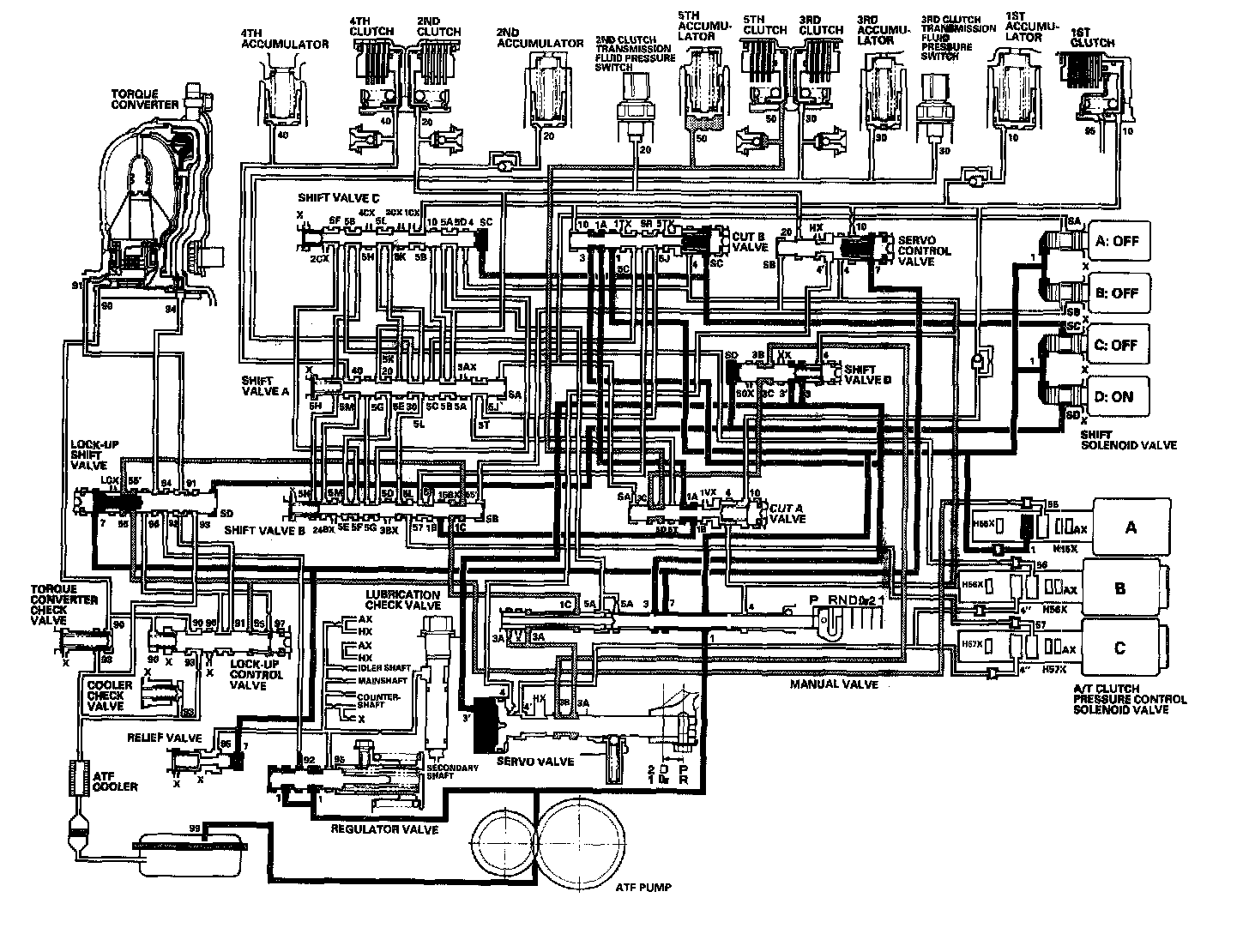 The manual valve is moved into the R position, line pressure (1) becomes line pressure (1), (3), and (7) at the manual valve. The PCM turns shift solenoid valve D ON, and shift solenoid valves A, B, and C OFF. Shift solenoid valve D pressure (SD) is applied to the left end of shift valve D, and shift valve D is moved to the right side to uncover line pressure (3) port leading to the servo valve. Line pressure (3') from shift valve D flows to the servo valve, and pushes the servo valve to the reverse position. The PCM controls A/T clutch pressure control solenoid valve A to regulate A/T clutch pressure control solenoid valve A pressure (55), and A/T clutch pressure control solenoid valve A pressure (55) flows to lock-up shift valve, shift valve B, manual valve, servo valve, shift valve D, and cut A valve. A/T clutch pressure control solenoid valve A pressure (3C) becomes 5th clutch pressure (50) at the cut A valve. 5th clutch pressure (50) is applied to the 5th clutch, and the 5th clutch is engaged with the A/T clutch pressure control solenoid valve A pressure mode.