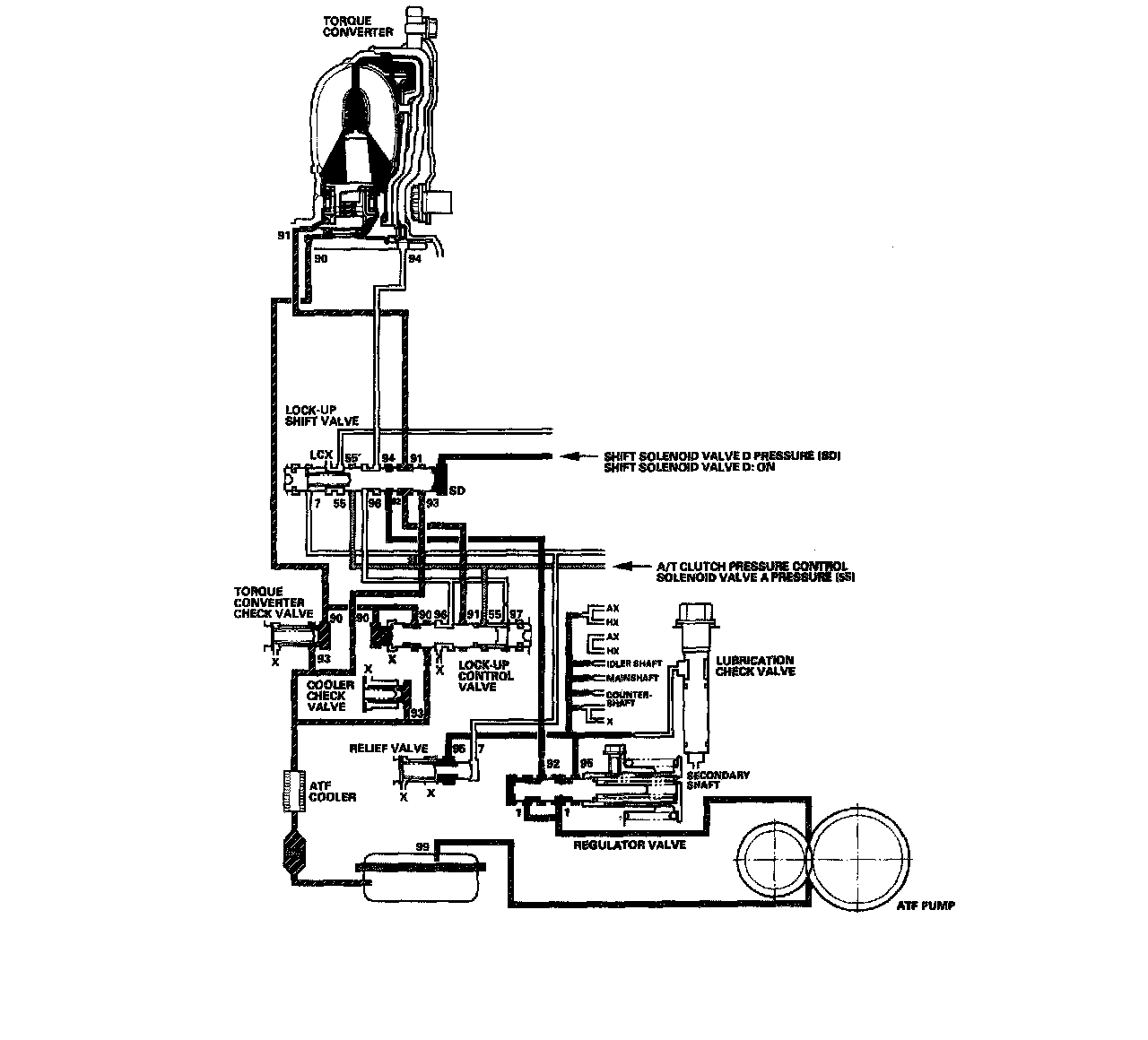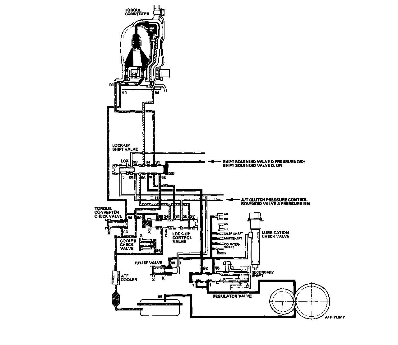 As the speed of the vehicle reaches the programmed value, the PCM turns shift solenoid valve D ON. Shift solenoid valve D pressure (SD) is applied to the right end of the-lock-up shift valve to switch the torque converter pressure port leading to front of the torque converter. Torque converter pressure (91) enters into the front of the torque converter to engage the torque converter clutch piston. The PCM also controls A/T clutch pressure control solenoid valve A to regulate A/T clutch pressure control solenoid valve A pressure (55), and A/T clutch pressure control solenoid valve A pressure (55) is applied to the lock-up control valve. Torque converter pressure (94) drained from the back of the torque converter is applied to the right side of the lock-up control valve, and torque converter pressure (90) is applied to the left side of the lock-up control valve. The lock-up control valve controls the amount of the lock-up by receiving these pressures. The torque converter clutch is engaged partially during torque converter pressure (90) in the left side of the lock-up control valve is higher, and the torque converter clutch is engaged securely according to amount of pressure in the right side of the lock-up control valve. Under this condition, the torque converter clutch is engaged by pressure entering into the front side of the torque converter; this condition is partial lock-up.