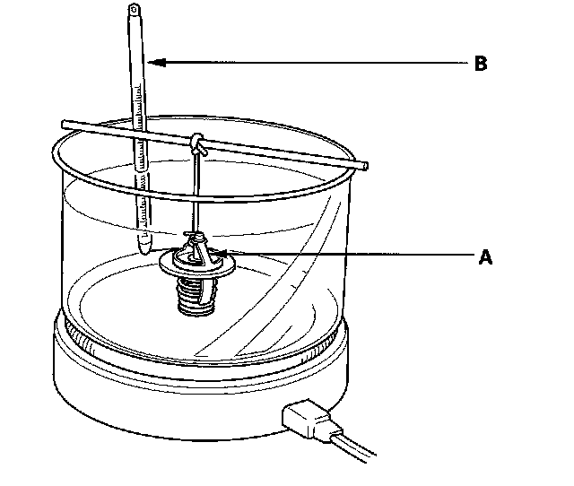 1. Suspend the thermostat (A) in a container of water. Do not let the thermometer (B) touch the bottom of the hot container.