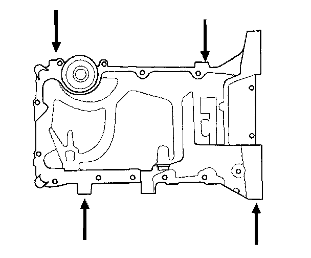 17. Using a flat blade screwdriver, separate the oil pan from the block in the places shown.
