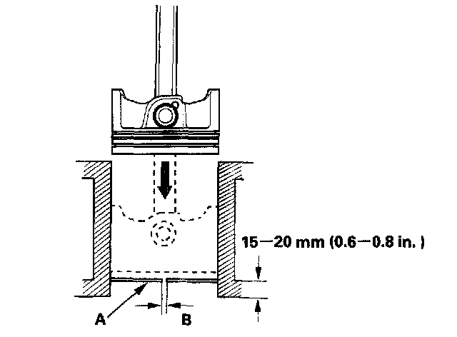 4. Using a piston that has its rings removed, push a new ring (A) into the cylinder bore 15 - 20 mm (0.6 - 0.8 inch) from the bottom.