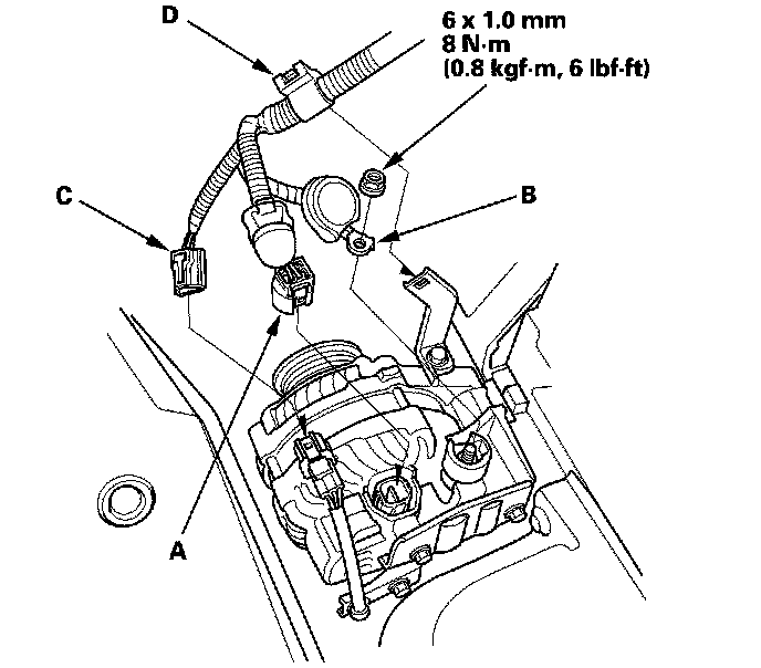 8. Connect the A/C compressor clutch connector (C), and install the harness clamp (D).