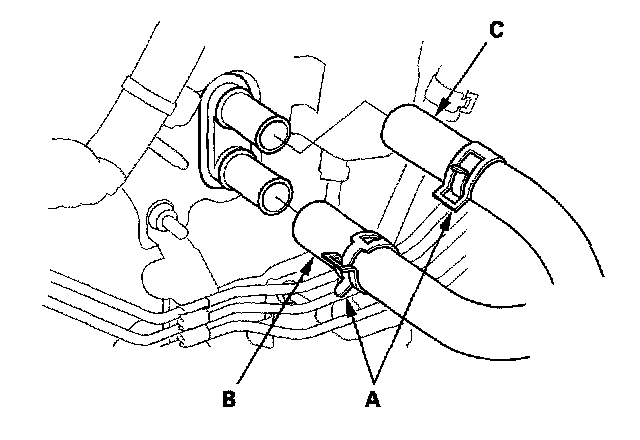 6. From under the hood, slide the hose clamps (A) back. Disconnect the inlet heater hose (B) and the outlet heater hose (C) from the heater unit. Note the orientation of the hose.