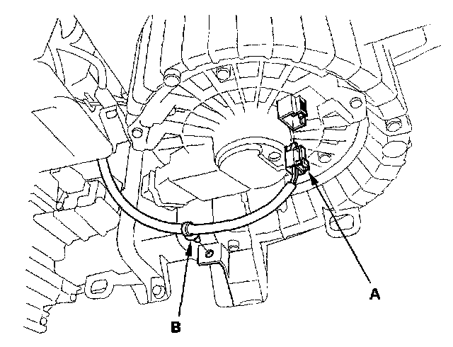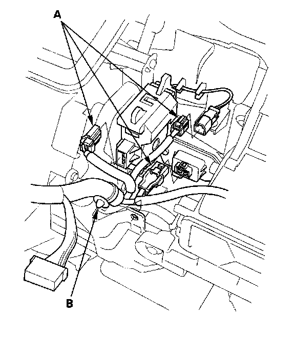 11. Disconnect the connectors (A) from the mode control motor, the evaporator temperature sensor, and the power transistor. Remove the wire harness clips (B).