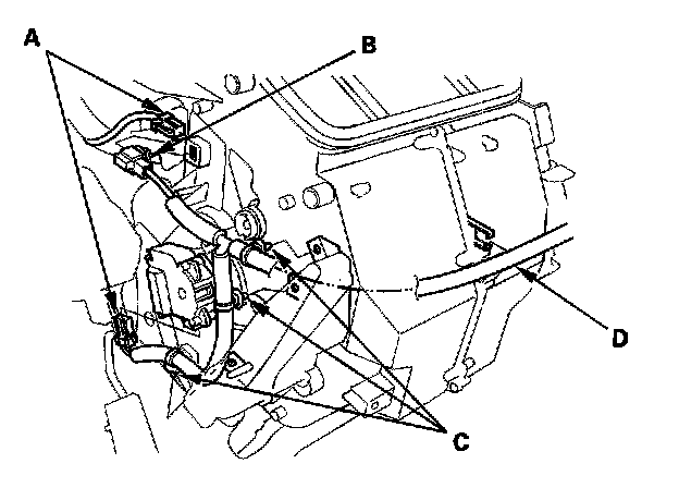 12. Disconnect the connectors (A) from the air mix control motor and A/C wire harness. Remove the connector clip (B), the wire harness clips (C), and the wire harness (D).