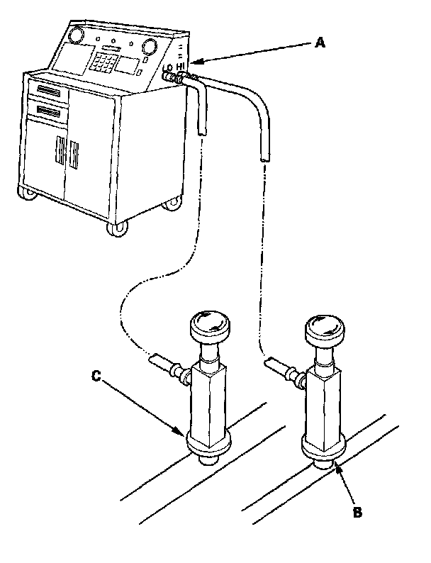 1. Connect an R-134a refrigerant recovery/recycling/charging station (A) to the high-pressure service port (B) and the low-pressure service port (C), as shown, following the equipment manufacturer's instructions.