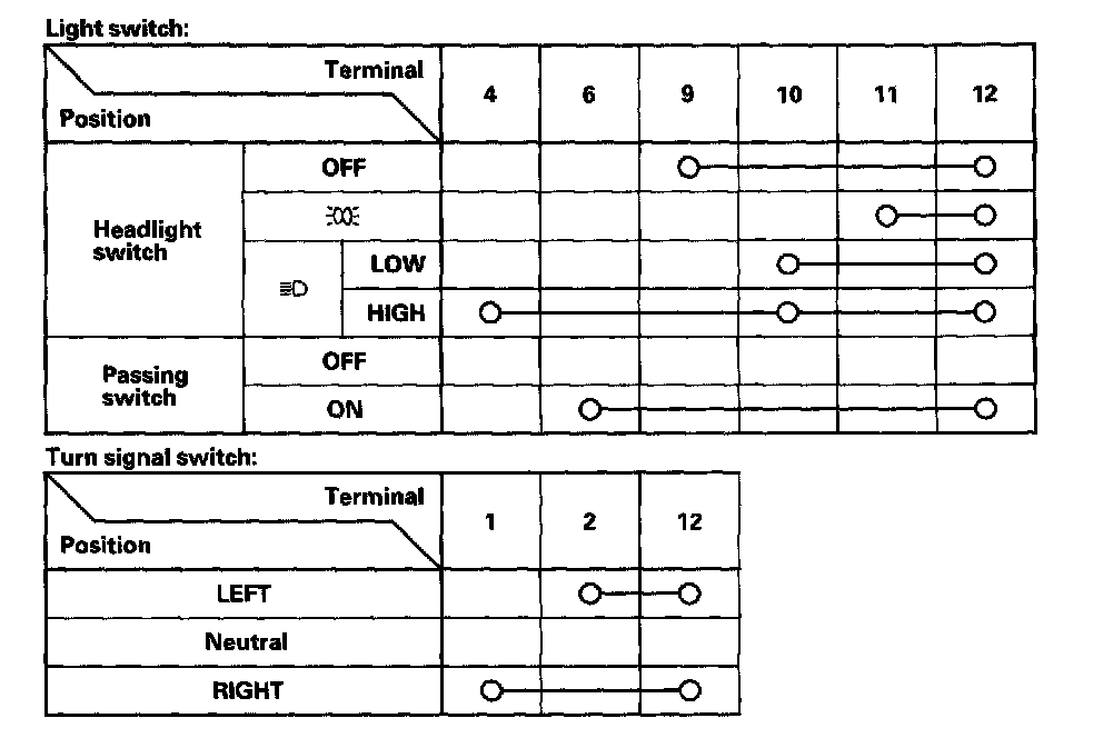 - If the terminals look OK, check for continuity between the terminals in each switch position according to the tables.
