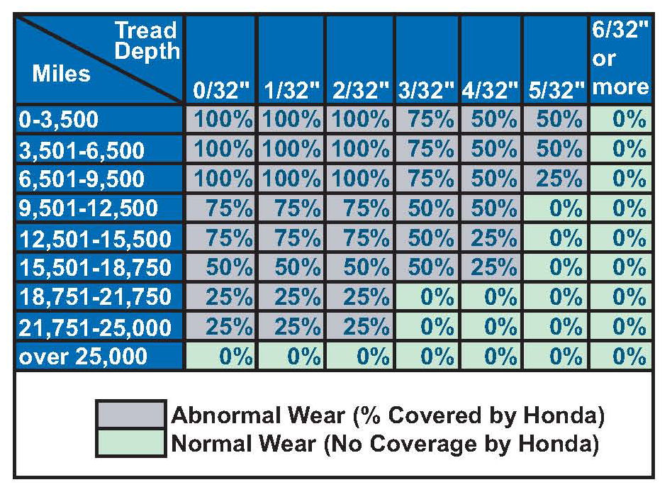 American Honda will pay a prorated amount, as shown in the chart below, for replacement of tires due to uneven or rapid rear tire wear, based on the tire's mileage.