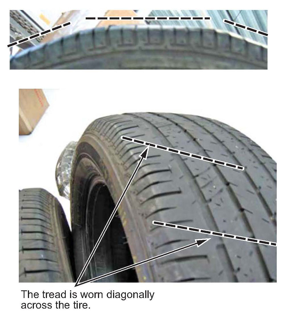 The tire is no longer round. There are high and low spots on the tire, worn in a diagonal pattern across the tread.