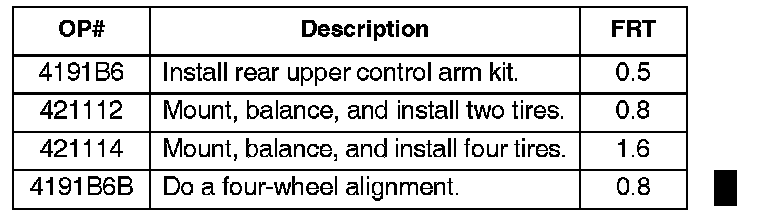 Install a rear upper control arm kit, replace the flange bolts and the worn tires (see the Tire Replacement Information chart), and do a four-wheel alignment to the new specification listed in REPAIR PROCEDURE.