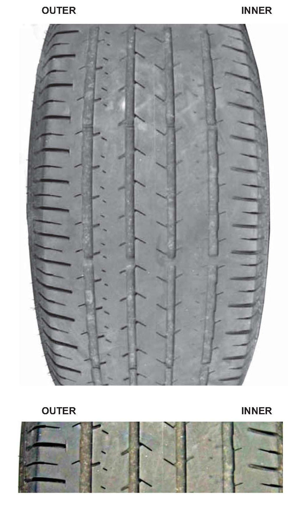 The tread on the inner edge of the tire is worn more than the tread on the outer edge.