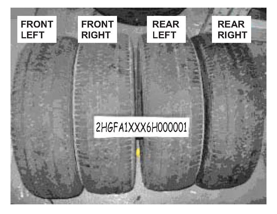 Arrange the tires together, and take a photo showing the tread wear of all replaced tires and the VIN, as shown in the example below. (If only two tires are replaced, photograph only those two tires.)