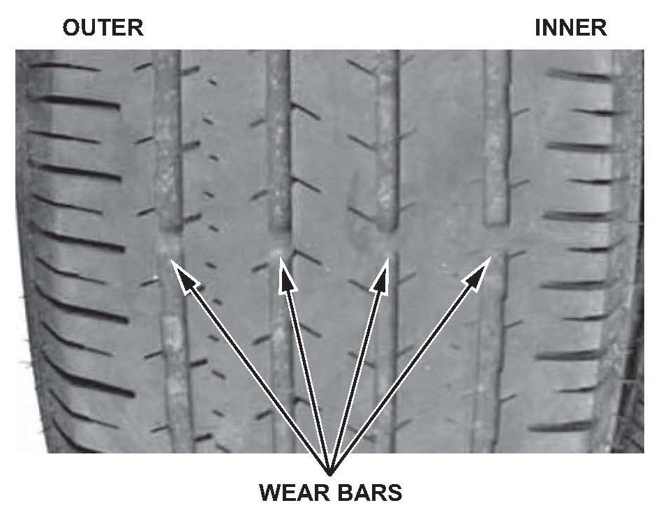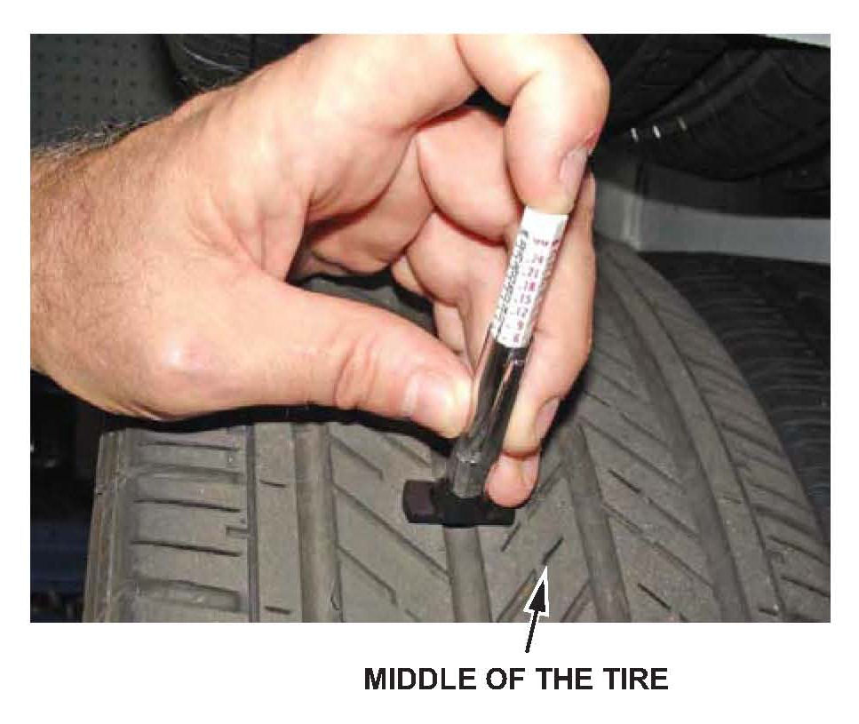 2. Measure and record the tread depth of the tires on the repair order using a tread depth gauge. Tread depth is measured at one of the grooves closest to the middle of the tire, from the top of the tread blocks to the bottom of the groove (not to the wear bars). If the inner edge of the tire is heavily flat- spotted or bald, use a value of 2/32" instead of the actual tread depth to determine the prorated amount on the Tire Replacement Information chart on page 2. (See the photos under WARRANTY CLAIM INFORMATION.)