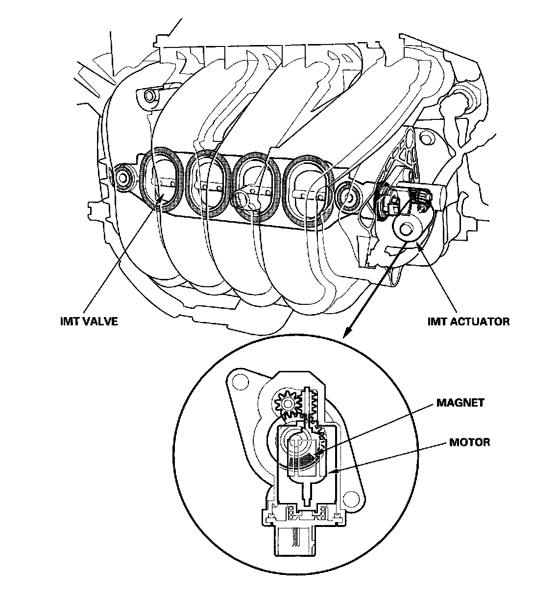 Engine power is adjusted by opening and closing the intake manifold tuning (IMT) actuator. When the valve is closed, there is high torque at low engine speed. When the valve is open, there is high torque at high engine speed. The intake manifold tuning (IMT) valve actuator contains a sensor that detects the IMT valve position and sends it to the PCM.