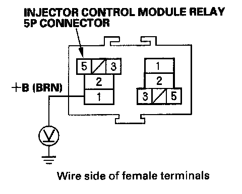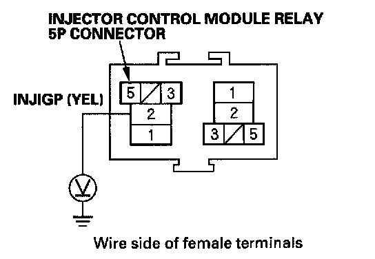 15. Measure voltage between injector control module relay 5P connector terminal No. 2 and body ground.