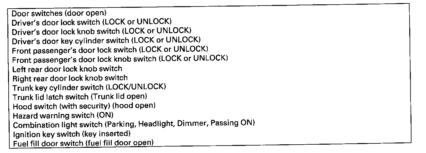 When the ignition switch is turned ON (II), the MICU, gauge control module, immobilizer-keyless control unit-receiver, and PCM wake up at the same time without "talking" to each other through the communication lines. When any switch in the multiplex integrated control system is turned on, it wakes up its related control unit which, in turn, wakes up the other units. After confirming the sleep mode, look in the following table for the switch most related to the problem. Operate that switch and see if its control unit wakes up.