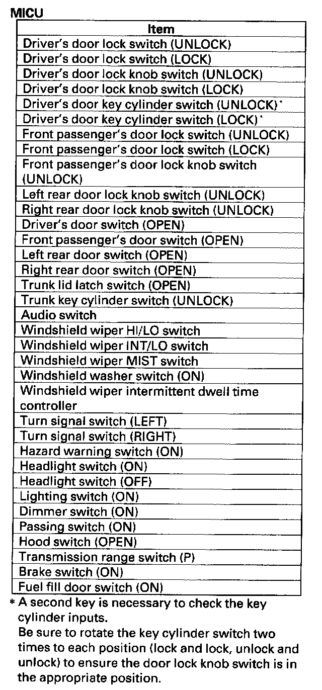 11. The following tables list the circuits that can be checked in Test Mode 2. Operate the switch that is most closely related to the problem. If the circuit is OK, the ceiling light will blink once. If the circuit is faulty, there will be no indication.