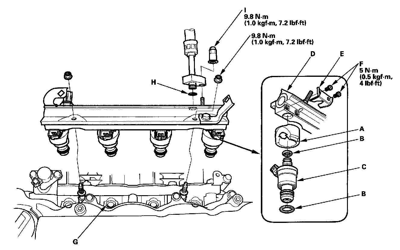 13. Install the fuel rail and the injector into the cylinder head (G).